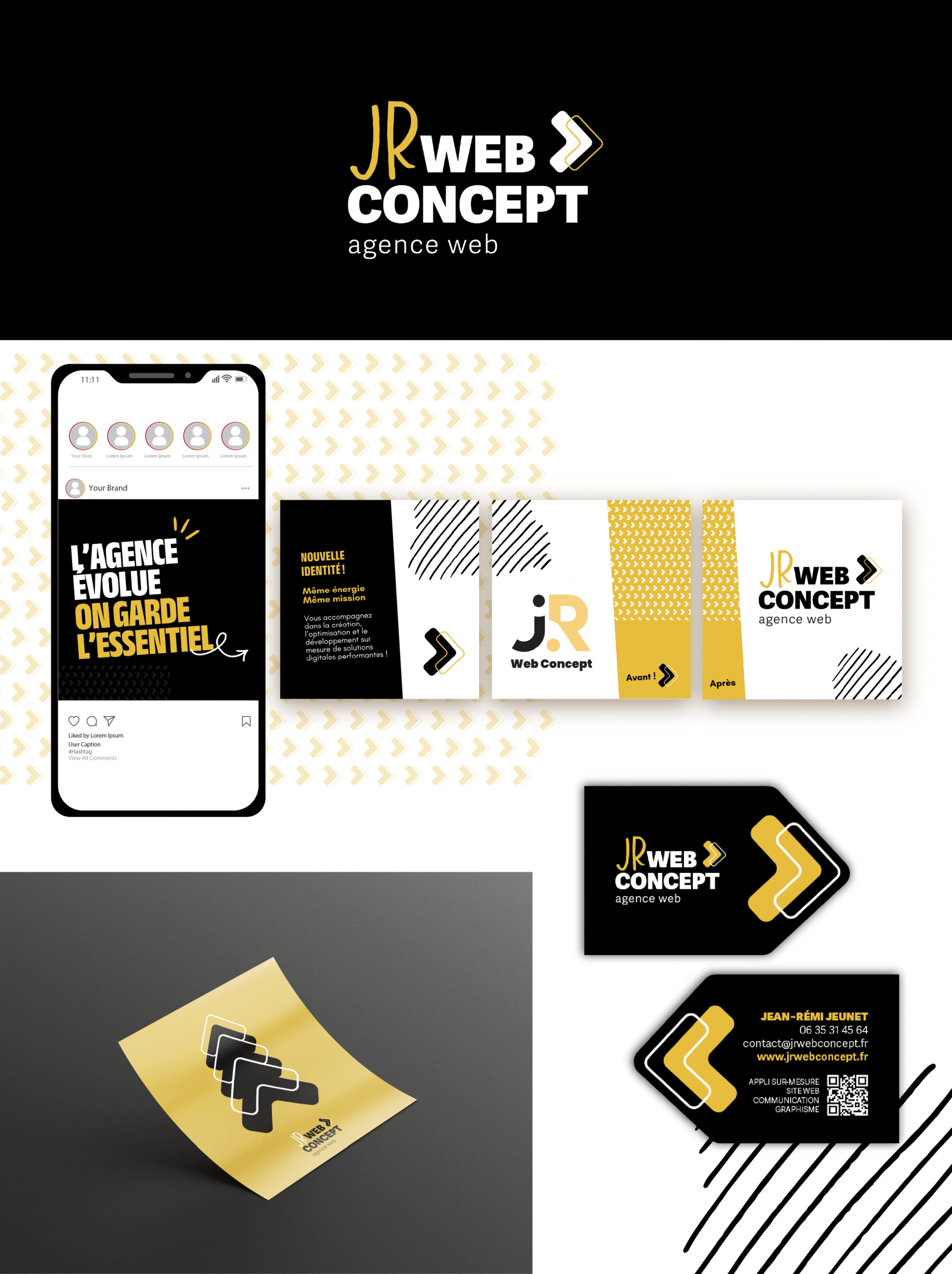 JR Web Concept, c’est l’expertise web sur mesure incarnée par un développeur passionné et partenaire de longue date. Quand il m’a demandé de refondre son logo suite à l’évolution de son entreprise, l’objectif était clair : créer une identité à la hauteur de son expertise, moderne et reconnaissable.